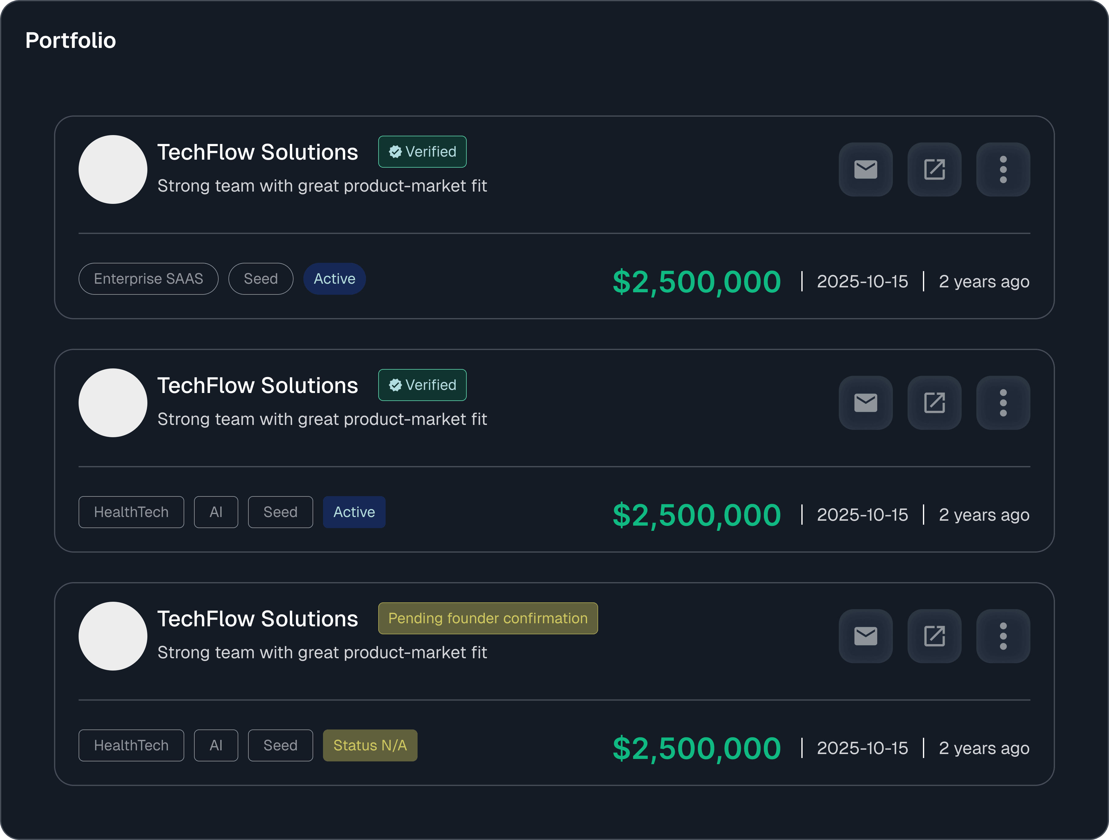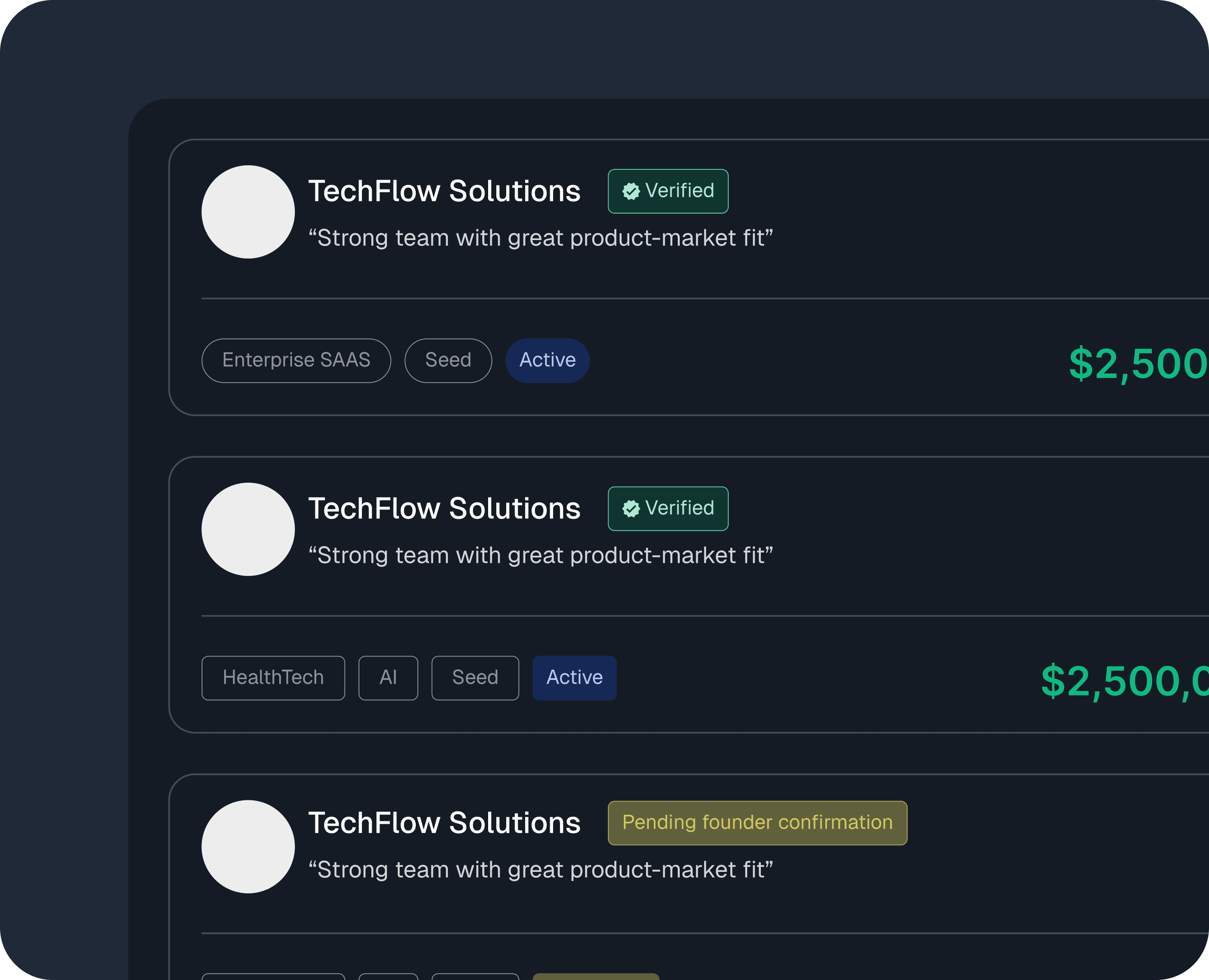 Every founder passes identity checks, traction review, and sector tagging before going live.
