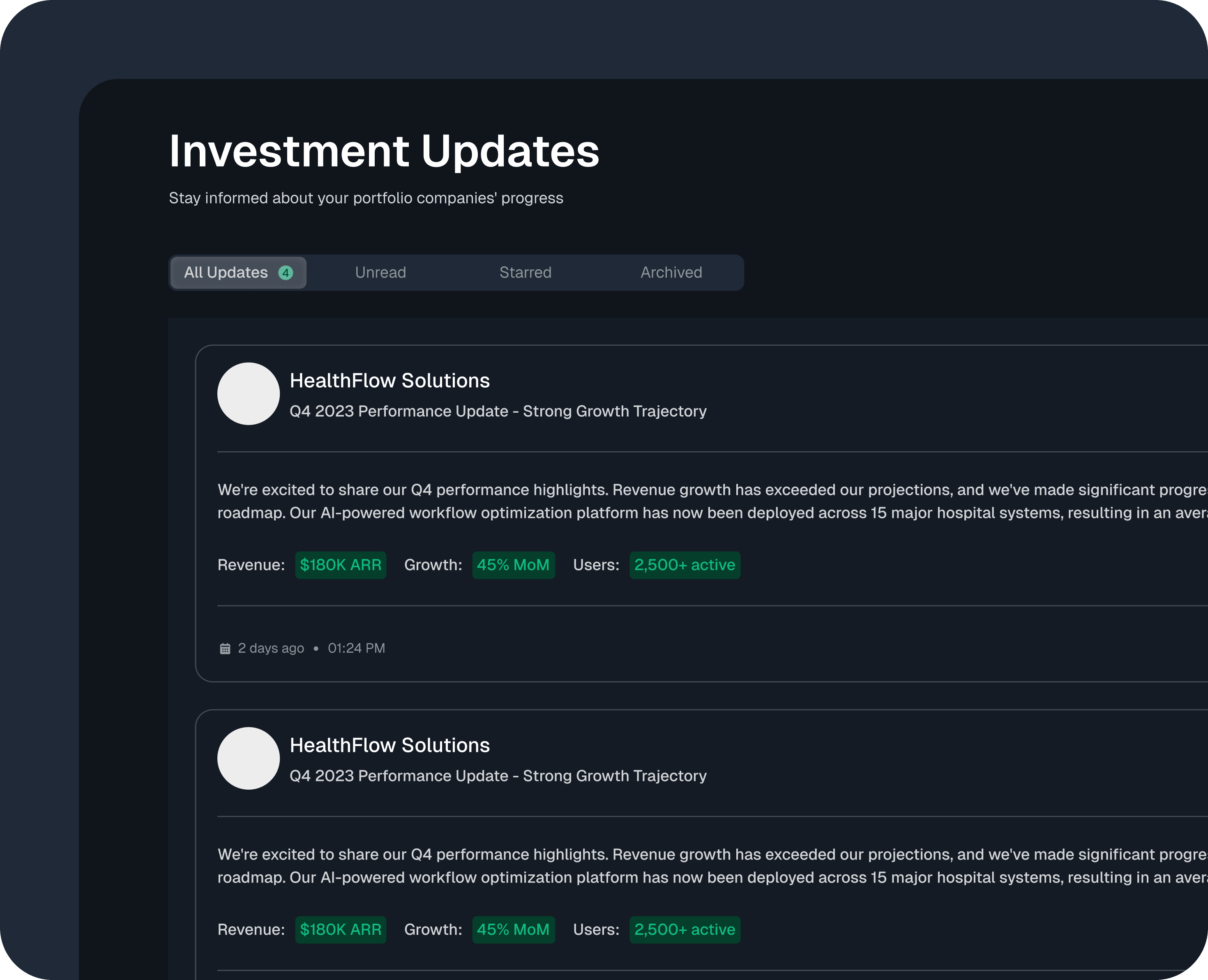 Once you invest, FoundaBridge helps you follow your portfolio startups' updates, growth, and performance.